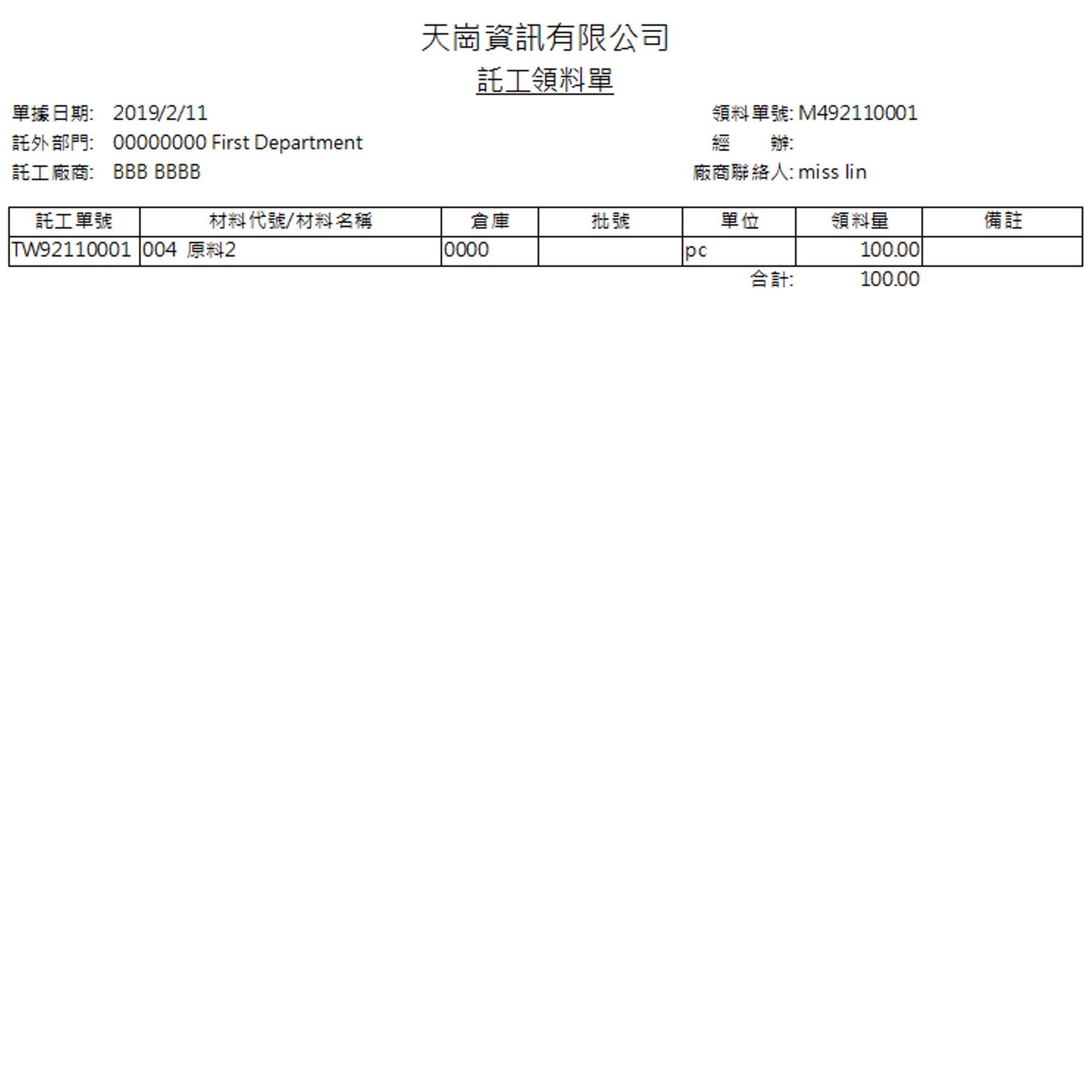 託外領料單(託工領料單)